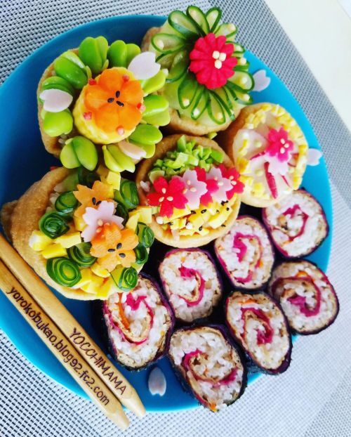 お稲荷さんの袋口を上にしてちょっと中にお揚げさんを入れて そこに 塩漬けしたキュウリや甘酢漬けの大根やニンジン 塩枝豆や クッキー型でくりぬいたハムや 煮たお野菜をのせるとちょっと華やかになりますよね^^ ぶぶあられも添えたりして 春を満喫するおいなりさんと巻きずしです^^#高校生弁当 #obento #寿司 #ランチ巡り #ふく天 #わかめむすび #いなり寿司 #稲荷寿司 #おいなりさん#デコ弁 #ラン...